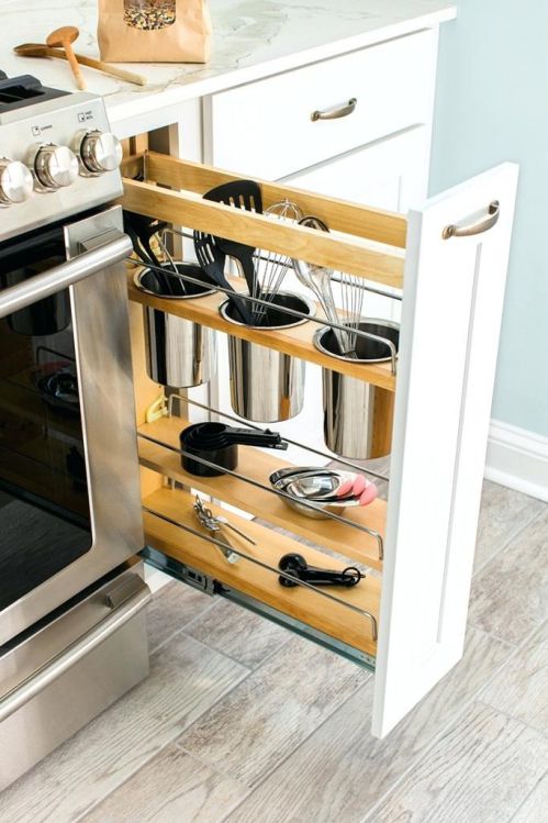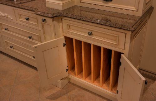 Một trong những dụng cụ nhà bếp khó lưu trữ nhất đó là các vỉ nướng, thớt và nắp vung. Tủ có thể được trang bị các vách ngăn dọc để giữ các vật này, vừa có thể nhìn thấy được, vừa tiện lợi mà không sợ bị hư hỏng hay uốn cong.