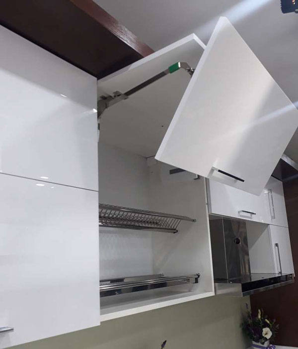 Phụ kiện lắp cho tủ bếp 2 cánh mở lật lên nhỏ gọn tiện ích, không gây nguy hiểm khi mọi người sử dụng khi mở cửa tủ như bình thường.