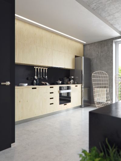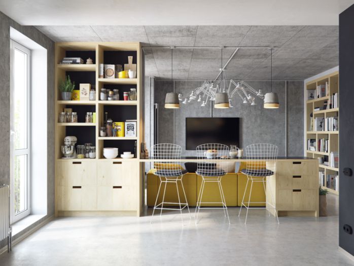 Các bức tường được phủ bằng bê tông thô, và tương tự trần và sàn nhà tạo nên một phong cách công nghiệp. Bê tông tạo ra một không gian hiện đại và tạo cảm giác mềm mại hơn và các nhà thiết kế đã kết hợp khéo léo các màu sắc thông qua việc sử dụng gỗ màu sáng trong nhà bếp cùng những điểm nhấn màu vàng đậm.
