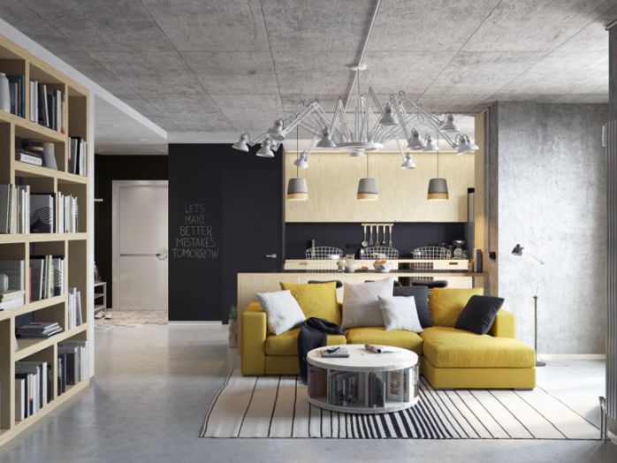 Tân Kỷ Nguyên thích ý tưởng làm ấm không gian bằng màu vàng sáng như ghế sofa trong thiết kế này và một vài phụ kiện và tủ bếp gỗ sử dung tông màu sáng ấm áp, tạo cảm giác ấm cúng trong khi bê tông cho cảm giác lạnh.