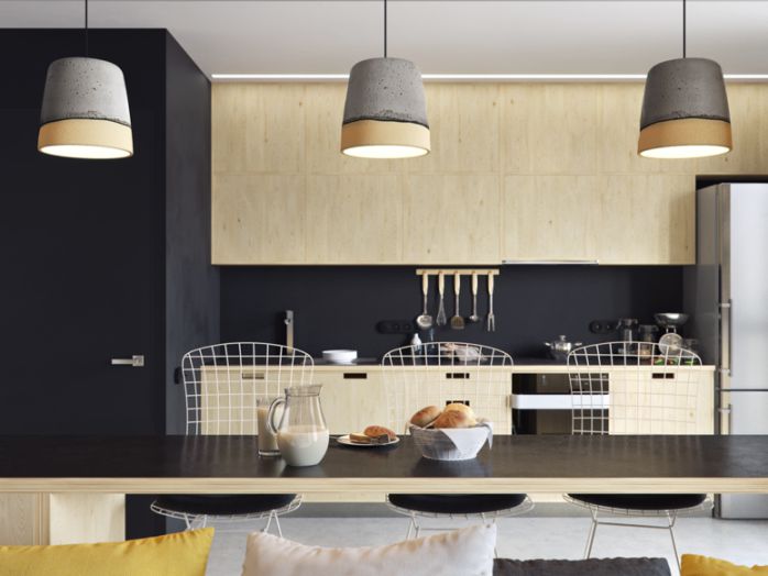 Tủ bếp gỗ sáng màu và đồ nội thất tương phản với màu đen trong nhà bếp